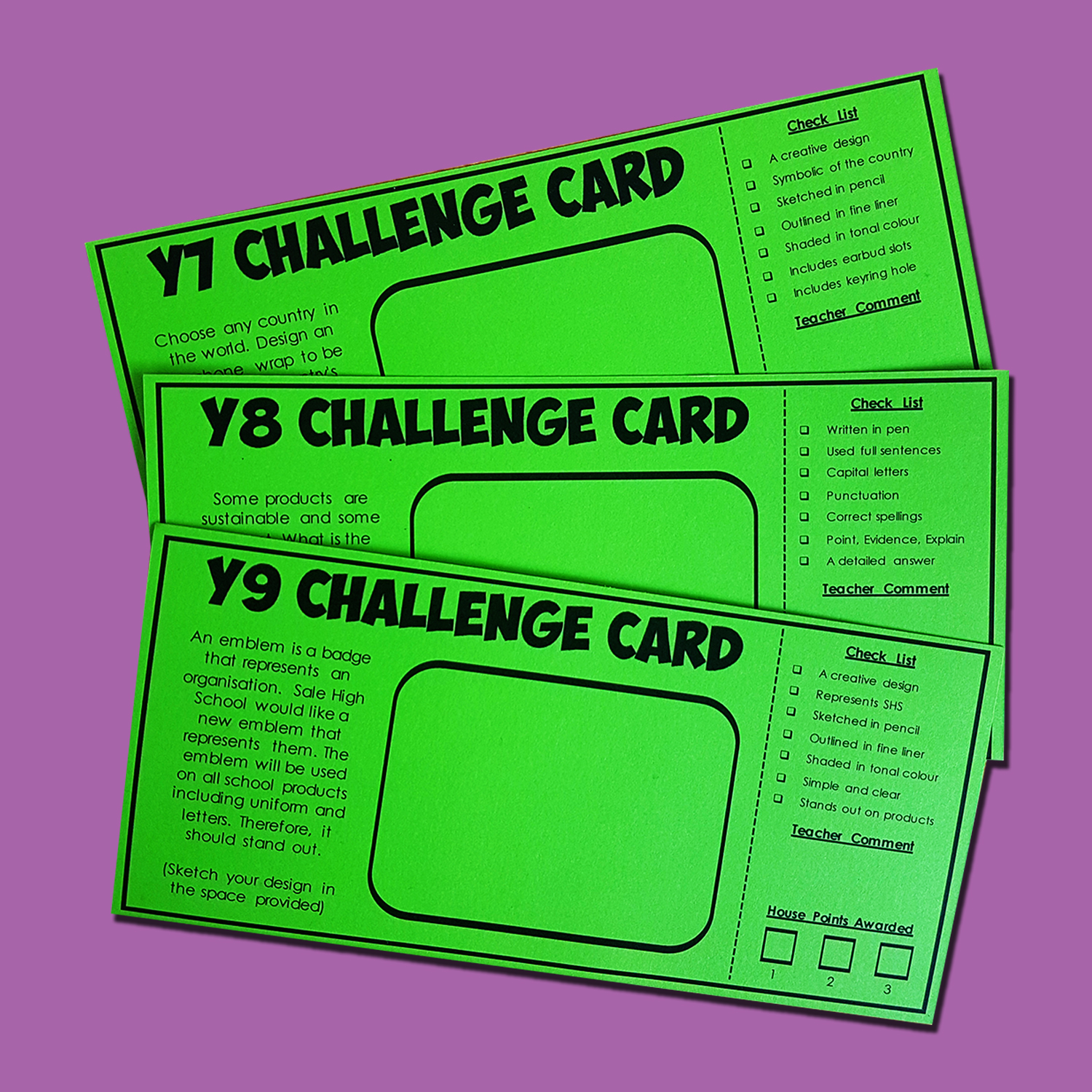 Each card includes a checklist (which are evident in all of my Technology booklets), so that students can tick off success criteria as they work through the activity. Challenge Cards also include house point rewards which are dependant on how well the student has completed the challenge. There is also a space for a teacher comment.
